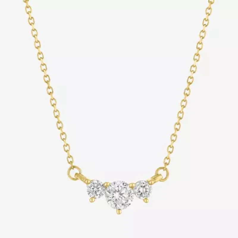 This women's pendant necklace features a classic three-stone design with a center round-cut Lab Grown Diamond flanked by two smaller Lab Grown Diamonds, all set in a delicate 10K Yellow Gold cable chain. Wear it on its own or layered with other necklaces.