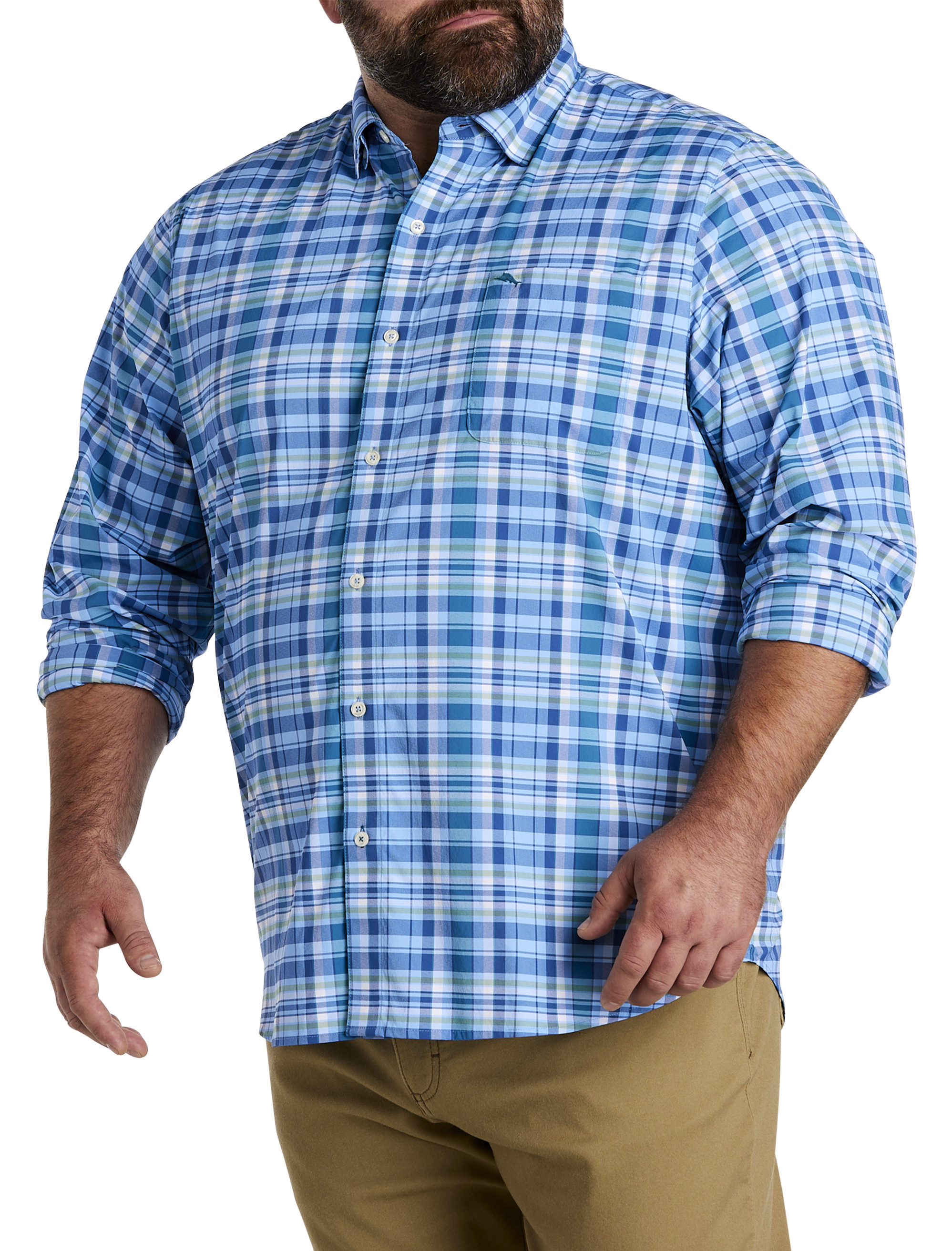 A fun new plaid shirt for your collection, this Tommy Bahama shirt has a laid-back, easy vibe. Combining timeless style with cool comfort, it's designed in a soft nylon fabric with a generous helping of stretch for ease and the freedom to move without restriction. It has a roomy fit and a comfortable feel. Worn on its own or layered over a tee, the versatile style looks great with your favorite pair of jeans, khakis or twills for casual style.