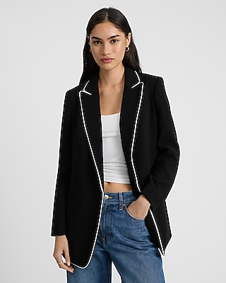 A classic boyfriend blazer elevated with piped detailing. The perfect style to level up your work outfit or layer on for a night out.