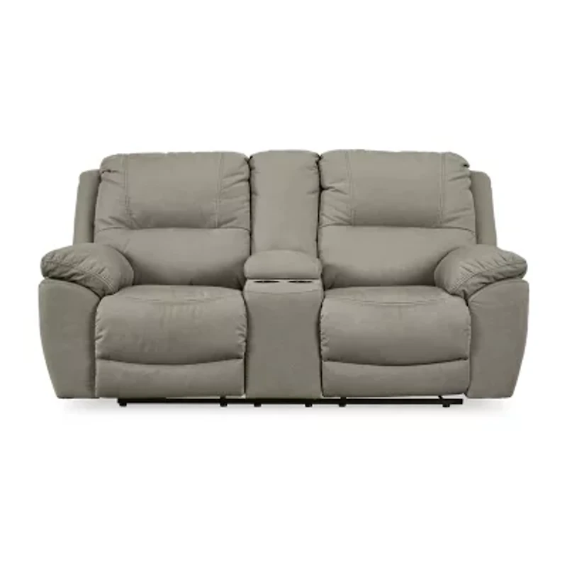 Kick back, relax, and enjoy some sports on TV with this reclining loveseat. You will love its double stuffed pillow top arms and soft-as-suede faux leather upholstery. The family-friendly dark gray color and creative stitching add panache. Recline in comfort even if floor space is limited, thanks to the space-efficient zero wall design. This bustle back loveseat with console and cup holders will always be a win.