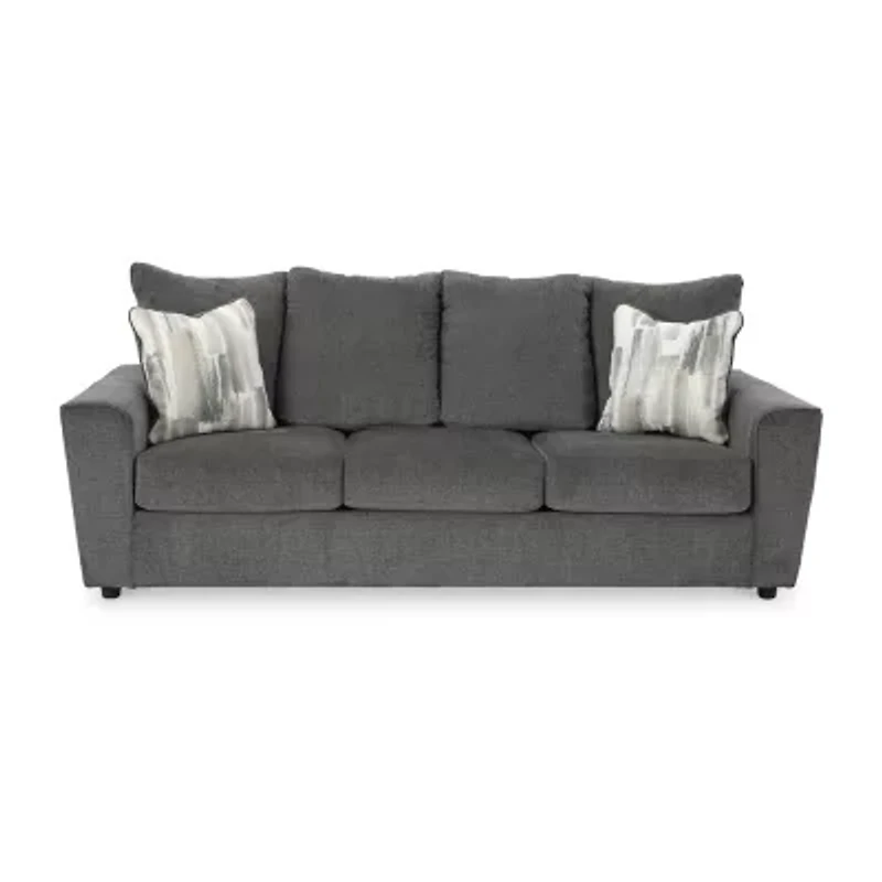What's new in neutrals? Shades of gray, of course. Embrace the sophisticated design trend with this gorgeous sofa that offers a clean-lined, contemporary style at a comfortably cool price. Sure to lift your spirits, the plush chenille fabric is fabulously neutral. Contemporary flared arms give it a distinctive flair. This sofa also arrives with two cool brushstroke accent pillows to elevate the taste and comfort level. When you're ready to transform your dull living room into a comfortable oasis, look no further than our selection of stellar sofas and loveseats for that. We're here to help with a wide selection of recliner sofas, sleeper sofas and so much more. With unmatched prices and quality, we're your one-stop destination for all things home.