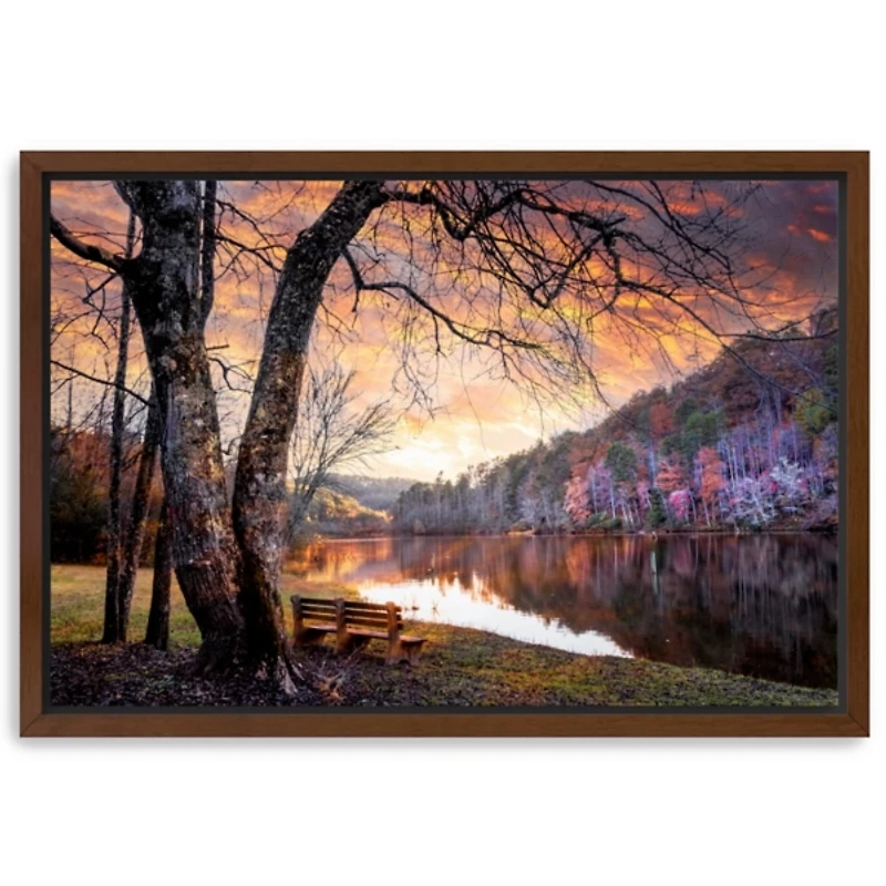 Design your very own lake house oasis by hanging our Silence of Sunset Framed Canvas Art Print on the wall. The warm tones in this photograph print create a relaxing scene that will bring bliss to any space. Art measures 38L x 1.8W x 26H in. Giclee printed on archival-grade, poly-cotton canvas Canvas stretched over solid wood Wrapped in a walnut brown wood floating frame Features a lake sunset landscape as subject Hues of brown, red, purple, orange, green, gray, and black Weight: 12.7 lbs. Hangs from back-mounted hardware Care: Dust with a soft, dry cloth. Avoid exposure to heat, direct sunlight, and moisture. This item is available at Kirklands.com only, not available in stores. Please note: this item cannot be shipped to APO/FPO addresses.
