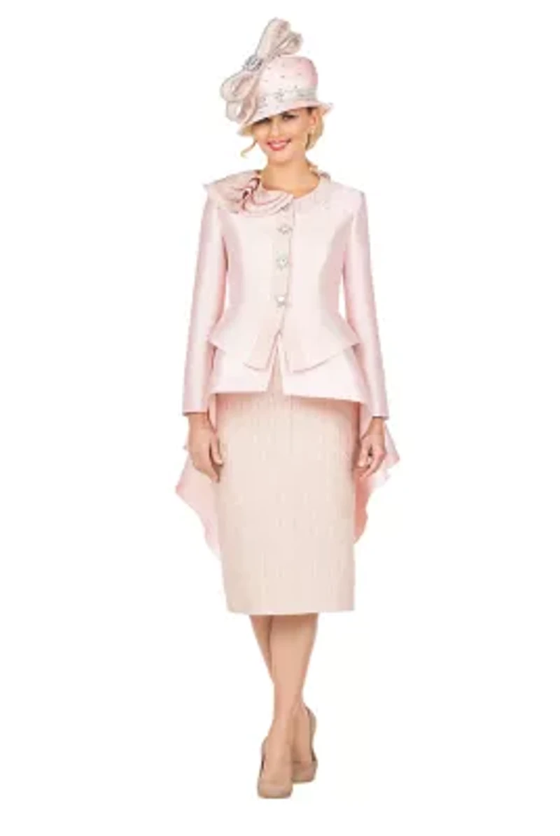 Soft, sophisticated, and undeniably graceful — this Pale Pink 2-piece suit is the definition of modern femininity. The tailored jacket features a sculpted peplum silhouette with a dramatic high-low hem that flows beautifully from every angle. A delicately layered ruffle detail at the shoulder adds dimension and couture-inspired artistry, while sparkling jeweled buttons create a polished, regal finish. Subtle embellishment near the neckline catches the light with quiet brilliance. The coordinating skirt is crafted in a textured brocade fabric that adds depth and refinement, offering a sleek, knee-length silhouette that flatters and elongates. Together, the pairing creates a look that is both structured and fluid — strong yet softly romantic. Perfect for church, weddings, and special celebrations, this ensemble speaks to the woman who leads with elegance and confidence. Grace in motion. Beauty in every detail. 2 Button closure Long sleeve Imported Product Specifications 25 Material & Care Polyester Dry clean only