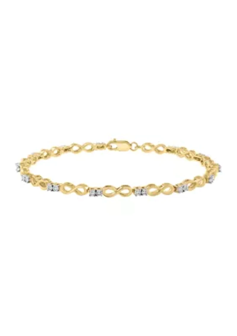 This exquisite tennis bracelet is a timeless piece that exudes elegance and sophistication. Crafted in lustrous gold over silver, it features 26 sparkling diamonds, each prong-set to perfection. With a total diamond weight of 1/10 carats, this bracelet is sure to catch the light and turn heads wherever you go. The polished finish adds a touch of luxury, while the lobster closure ensures a secure and comfortable fit. Perfect for any occasion, this bracelet is a must-have addition to your jewelry collection. 26 Diamonds Lobster closure Color rating: I, J Clarity rating: I3 Polished finish Prong setting Lifetime limited liability warranty Imported Product Specifications 7" L 1/10 ct. t.w. Diamond Material & Care Gold over silver Clean with a soft cloth