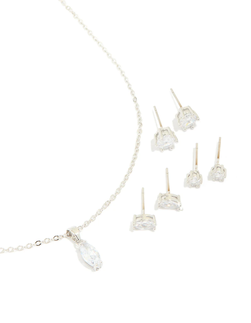 Complete your look with the Silver Cubic Zirconia Pendant Necklace & Earrings Set, a must-have for any jewellery lover. This stunning set includes a pear-shaped cubic zirconia drop pendant necklace, perfect for adding a touch of elegance to any outfit. Paired with three versatile pairs of cubic zirconia earrings, you’ll have endless options to mix and match. Whether you’re dressing up for a wedding, a dinner date, or simply adding sparkle to your everyday style, this silver-toned set is your go-to. The delicate design makes it ideal for pairing with a flowy dress, a tailored blazer, or even your favourite casual ensemble. Perfect as a gift or a treat for yourself, this set is all about effortless sophistication and versatility. Dimensions: Chain Length: 45 cm