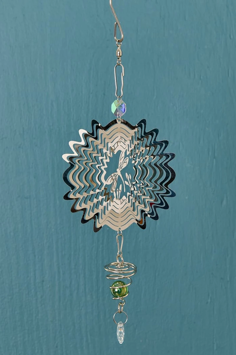 Bring light, movement, and a touch of nature-inspired elegance into your space with this steel dragonfly wind spinner decor. Handmade by artisans, this eye-catching piece features a detailed silver-tone dragonfly paired with a layered steel spinner design that gently rotates with airflow. Accented with faceted glass crystals and a green glass bead, it catches sunlight beautifully, casting soft rainbow reflections while creating a subtle, mesmerizing motion.The dragonfly symbolizes transformation, lightness, and adaptability, making this suncatcher not only decorative but meaningful. Perfect for bohemian home decor, hang it in a sunny window, patio, or garden space to enjoy both its shimmer and kinetic energy throughout the day. A unique blend of steel and glass, this hanging spinner suncatcher adds texture, movement, and a peaceful, reflective quality to any space. Each piece is handmade, making each slightly unique.