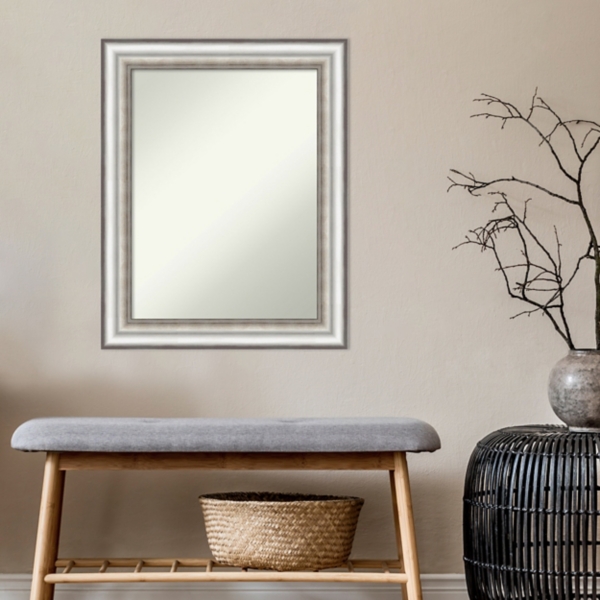 This Silver Embossed Frame Wall Mirror will beautifully brighten up any entryway, bathroom, or living room. Perfect for a traditional décor style, it makes a sophisticated statement in your home. Overall mirror measures 23.25L x 1W x 29.25H in. Crafted of polystyrene and glass Brushed silver finish Rectangular shape with embossed inner edge design Dark silver patina finish on inner edge Weight: 8.4 lbs. Hangs from back-mounted hardware Care: Dust with a soft, dry cloth. To clean mirror, spray a small amount of glass cleaner onto a lint-free cloth and wipe clean. This item is available at Kirklands.com only, not available in stores. Please note: this item cannot be shipped to APO/FPO addresses. WARNING: This product can expose you to chemicals including formaldehyde which is known to the state of California to cause cancer and birth defects or other reproductive harm.