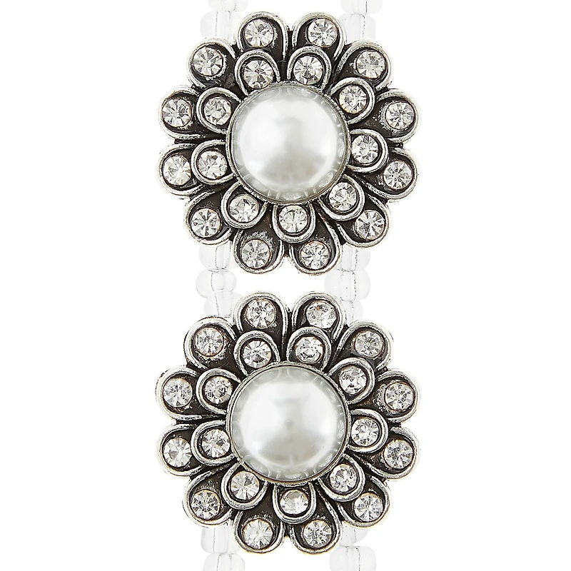 Design beautiful hair clips, brooches, and jewelry with the Bead Landing soldered large faux pearl flower slider. Its large flowers have faux pearl centers with stone-studded petals, making it ideal for accentuating stitchery, clothing and more. Pair this slider with other embellishments to make exquisite necklaces and décor accents.Details: White and silver colored 25 mm bead size 4 sliders Faux pearl and rhinestone-studded Zinc alloy, glass, plastic