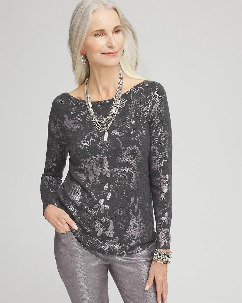Our Silver Floral Bateau Neck Sweater is a wonderful addition to your wardrobe. Designed with a silver foil floral pattern, this sweater will fast become a must-wear to fall and holiday events. The rib detail on the sleeve cuffs and hem of this super soft pullover gives it an elevated casual look. Paired with our Brigitte pants or jeans, this sweater is sure to be one of your seasonal favorites.
