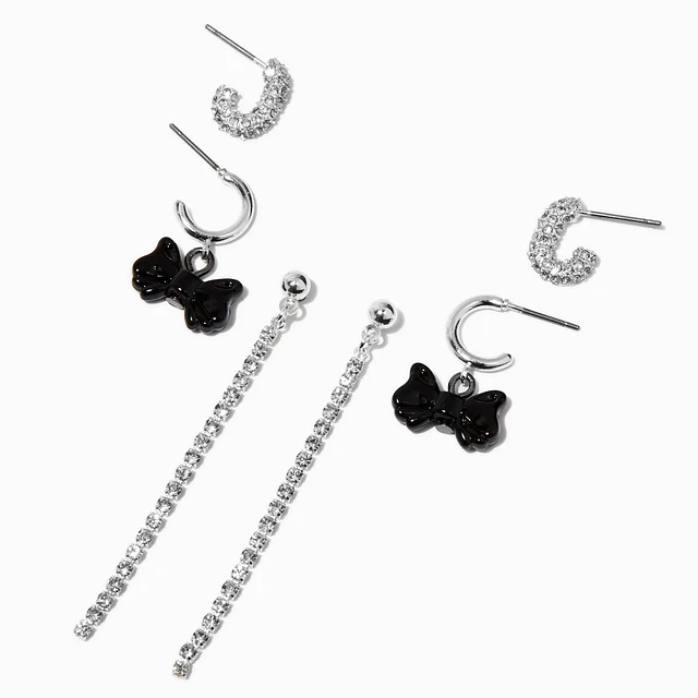 Silver-tone Black Bow Cup Chain Earring Stackables Set - 3 Pack