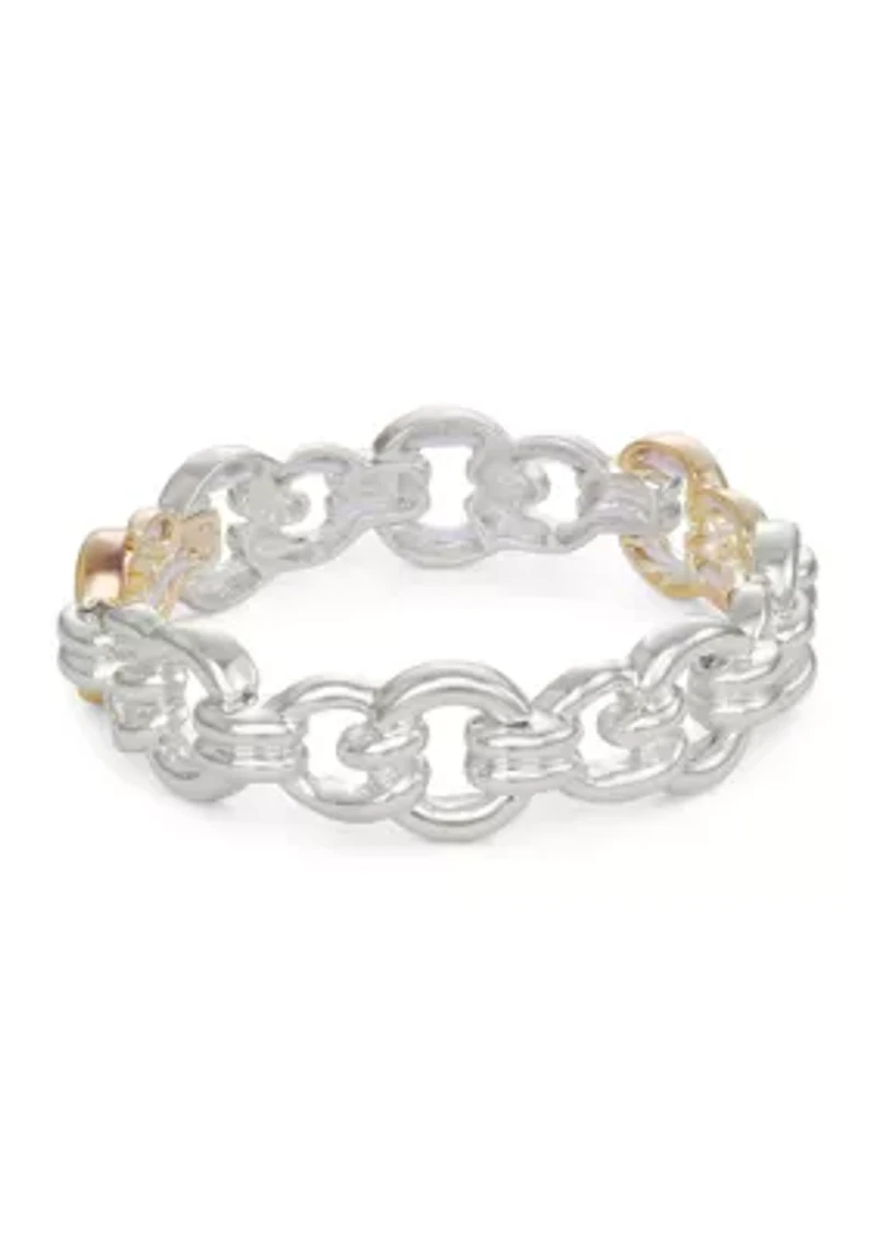 This exquisite bracelet, crafted from polished two-tone metal, exudes elegance and sophistication. Designed for women, it features a unique stretch bracelet style with a slip-on closure, ensuring a comfortable and secure fit. With its timeless design, this bracelet effortlessly complements any attire, adding a touch of glamour to your everyday look. Slip-on Polished finish Imported Product Specifications 8" L Material & Care Two-tone metal Clean with a soft cloth