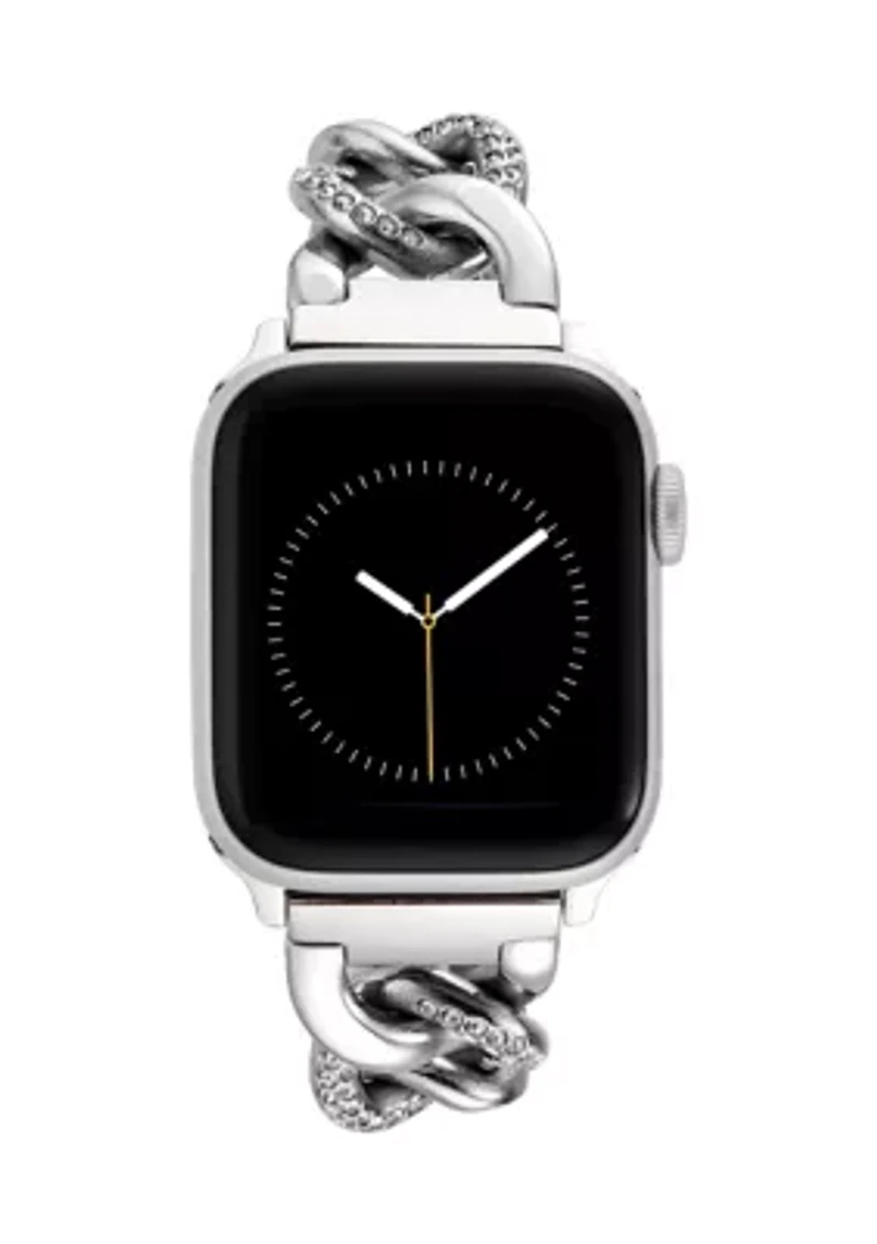 This silver-tone mixed metal chain watch with crystal accents is only compatible with the 42/44/45/Ultra (49 mm) Apple Watch®. Jewelry clasp Polished finish Flush setting 1-year limited liability warranty Imported Product Specifications 203 mm x 15 mm x 2 mm 5/8 ct. t.w. Cubic Zirconia Material & Care Silver-tone metal Clean with a soft cloth