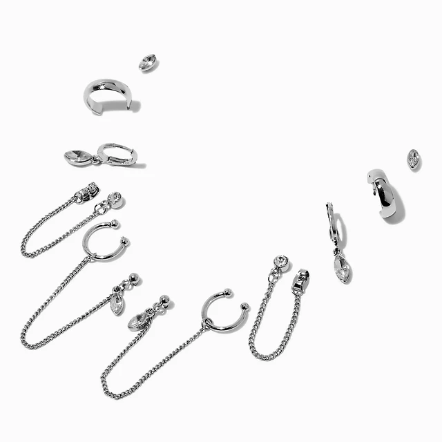 Silver Plated Cubic Zirconia Pave Huggie Chain Earrings 6-Pack
