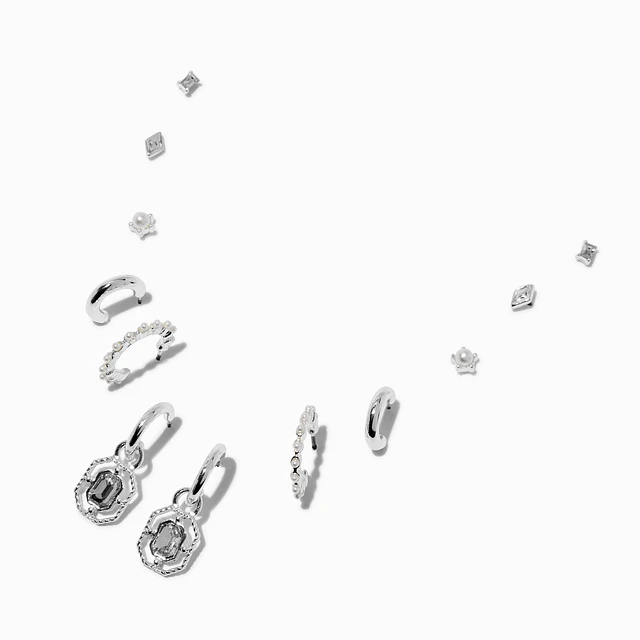 Silver-tone Pearl Crystal Earring Stackables Set - 6 Pack