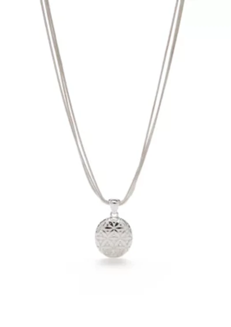 This exquisite silver-toned metal pendant necklace from Napier is a must-have for any jewelry collection. Its versatility makes it perfect for any occasion, whether you're dressing up for a special event or adding a touch of elegance to your everyday look. The pendant features beautiful filigree flowers, while the three rows of sleek snake chain add an extra touch of sophistication. With its 16-inch length, this necklace falls perfectly at the collarbone, making it a flattering choice for any neckline. Don't miss out on this stunning piece that will elevate your style effortlessly. Lobster closure Polished finish Imported Product Specifications 16" L Material & Care Silver-tone metal Wipe clean