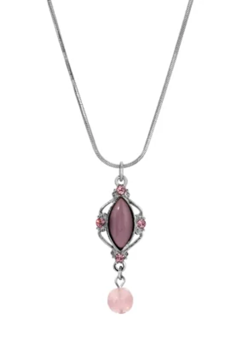 A navette-shaped amethyst moonstone rests at the center of an ornate silver-tone frame accented with soft pink crystals. Below it, a round amethyst glass bead sways gently, adding a graceful finishing touch. The pendant is suspended from a sleek snake chain, offering a smooth, refined look with vintage-inspired charm. Lobster closure, 2 Polished finish USA Imported Product Specifications 18"L X 1.75"W X .6"H, 18" Material & Care Metal, Silver-tone metal Clean with a soft cloth.