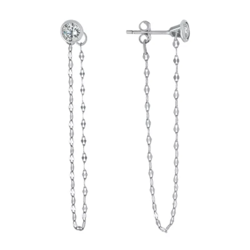 Simple and sleek best describes these Silver Treasures sterling silver chain with Cubic Zirconia drop earrings. Earrings are crafted in quality sterling silver, feature beautiful sparkling Cubic Zirconia stones, 50mm in length and have a post backing for a safe and comfortable wear. With the sleek design, these drop earrings can be worn with any wardrobe choice. Wipe drop earrings clean with a soft cloth.