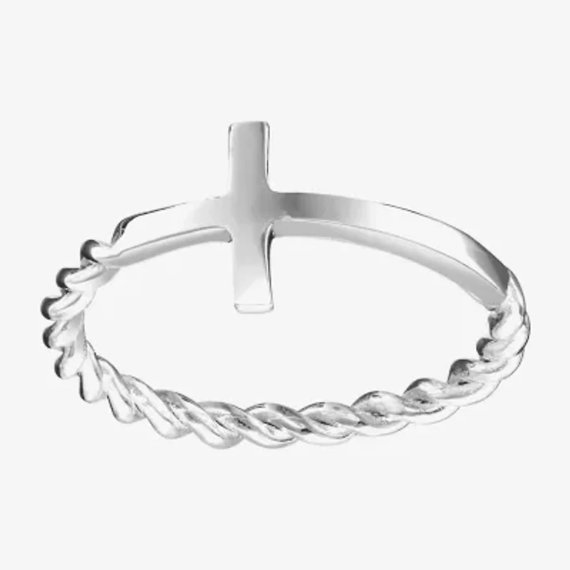 Adding this Silver Treasures sterling silver cross ring to your jewelry collection will add shine. This ring is crafted in sterling silver, features a high polished finish and a cross with a braided band. With the high polished finish, this ring will add a bold statement to any wardrobe choice. This ring can be worn alone or stacked with your other favorite ring choices. Wipe ring clean with a soft cloth.