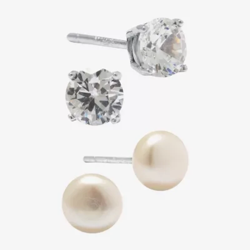 Silver Treasures Womens Cubic Zirconia Cultured Freshwater Pearl Sterling Silver Pair Earring Set