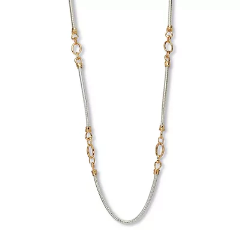 Make an impression with this silvertone necklace that features two-tone details. Interesting enough to wear alone, and easy enough to pair with other necklaces to create a layered look. You'll find endless ways to style this endless necklace! 38 inches, plus 3 inch extension, with lobster claw clasp.Silvertone, GoldtoneDimensions: 14 mm wide x 38 inches long x 3 mm high, plus 3 inch extensionIncludes gift box and drawstring pouchSilvertone, GoldtoneDimensions: 14 mm wide x 38 inches long x 3 mm high, plus 3 inch extensionIncludes gift box and drawstring pouch Lobster closure Polished finish Warranty available China Imported Product Specifications 0.67 in x 38 in x 0.55 in, 38" length Material & Care Metal, Silver-tone metal Clean with a soft cloth.
