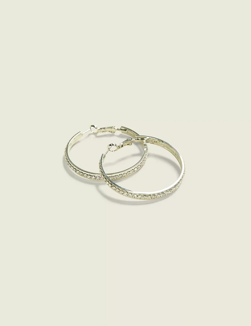 Available in Plus Size Pave stones along the outer edge give these hoop earrings an elevated touch. FIT: Secure, omega lever-back closures Hoop: 1.5" Our hoops are designed with a wider diameter than industry standard for a more comfortable fit. MATERIALS: NICKEL-FREE: Our jewelry is nickel-free for sensitive skin Spot Clean 65% Zinc/30% Glass/5% Iron Item Number #414923 Imported Plus Size Jewelry ". Plus Size Silvertone Pave Hoop Earrings, Women's, Lane Bryant