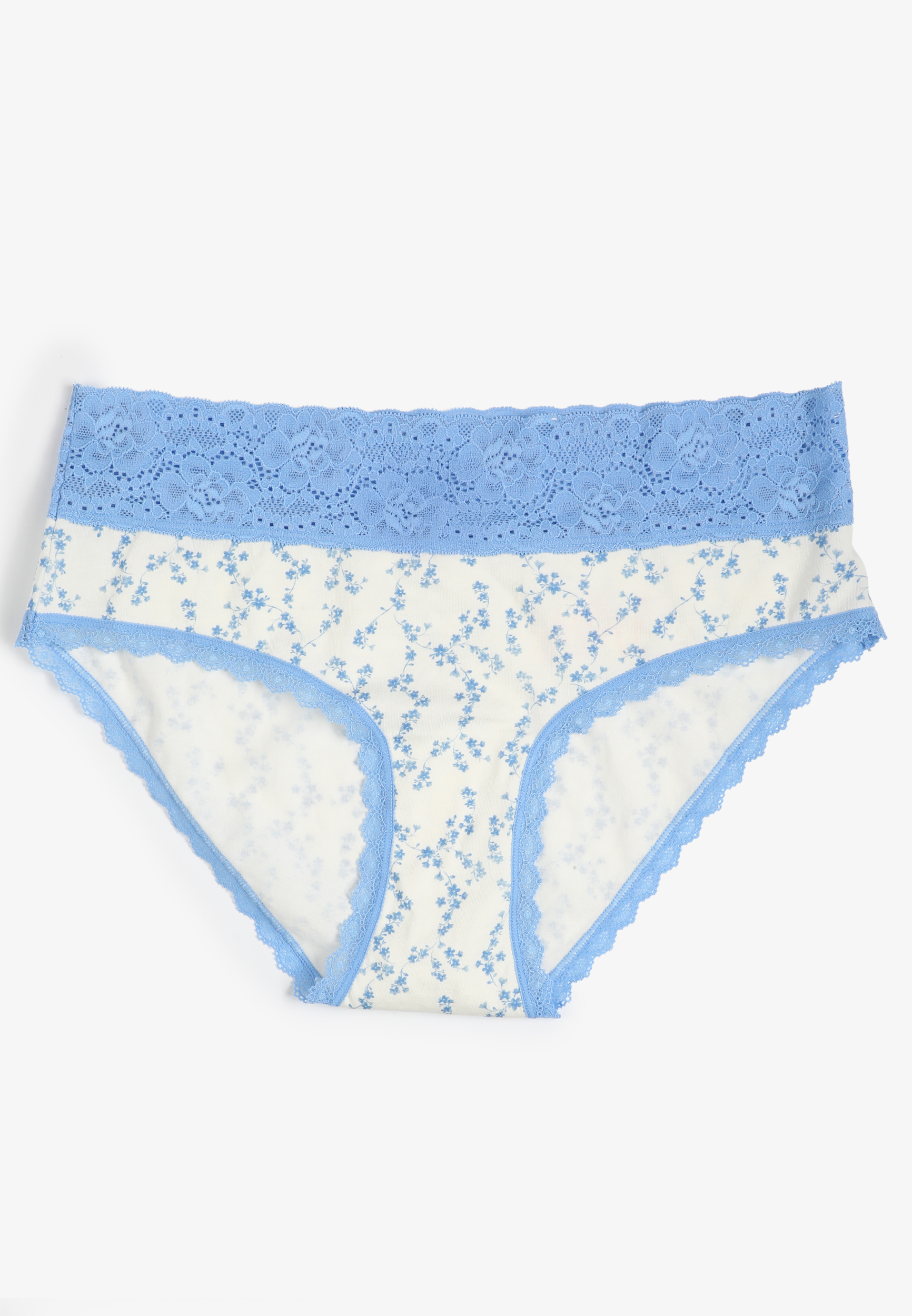 Our soft cotton hipster provides all day comfort! The secret ingredient is its stretchy lace waistband that holds the panty in place without digging in. It has a medium rise with moderate coverage.