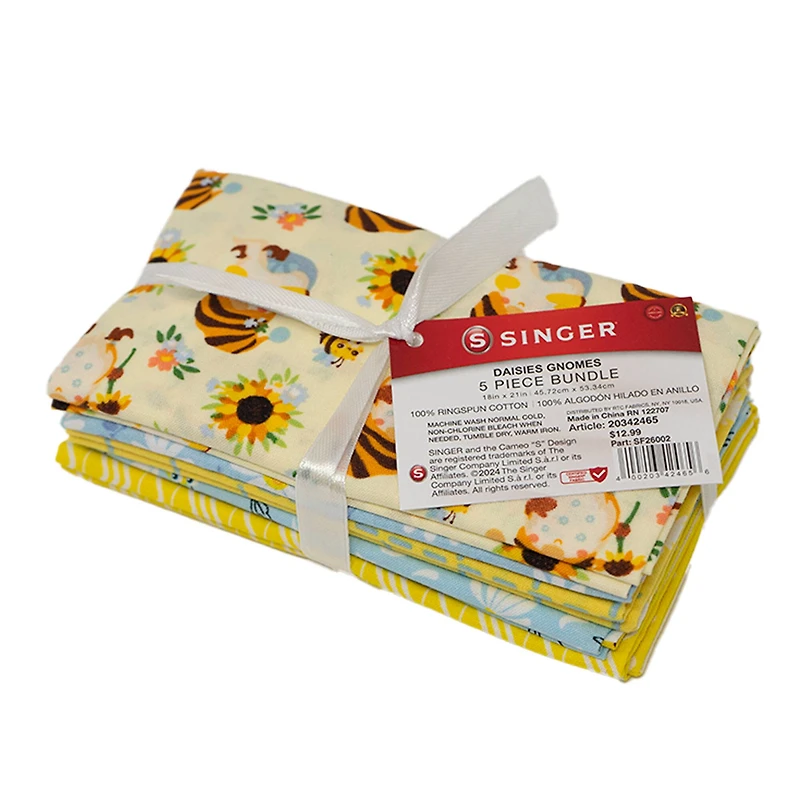 Add a splash of color to your project with our new SINGER® fabrics 100% ringspun print cotton fabric. It’s perfect for quilting, apparel, and more. Ideal for all your sewing and crafting projects. Details:Daisies gnomes printedEach piece measures: 18" x 21" 100% ringspun cotton Sold as 5 piecesGreat for quilting, apparel, and moreImportedNot intended for children's sleepwear