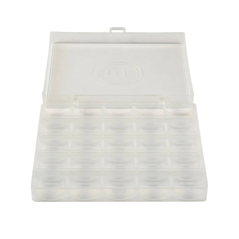 Keep your sewing tools neatly organized in a convenient storage box. This container will easily accommodate 25 bobbins. Place the box on your shelf to quickly access the bobbins when needed.Details: ClearHolds 25 bobbinsWill keep bobbins perfectly organizedPlastic