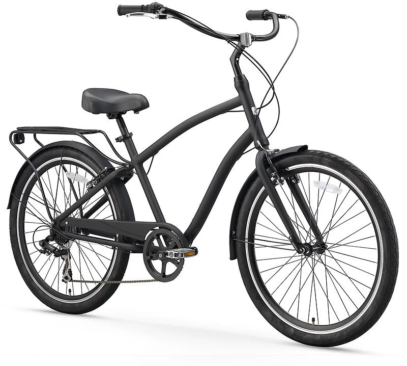 Whether you're riding around town or to work, the sixthreezero Men's EVRYjourney 26 in 7-Speed Hybrid Cruiser Bicycle is a great choice. Constructed with a 17.5-inch aluminum frame, the bike is lightweight and durable, while the half step-through design allows easy on and off. The 26-inch black wall tires complement the frame's finish, while the semi-slick tread is great for city streets and dirt paths alike. Plus, a 7-speed Shimano Tourney derailleur allows you to find the gear you need.