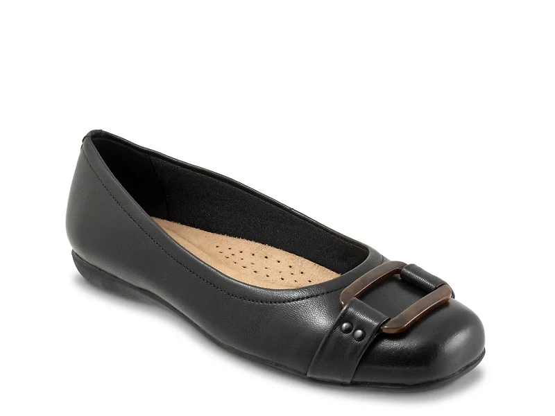 For those who appreciate both comfort and style, the Sizzle ballet flat from Trotters is a must-have. A leather silhouette with metal ornament buckle detail amplifies the classic look of this slip-on. With the soft fabric-lined cushioned footbed and a molded rubber sole, you can enjoy unmatched comfort and stability with every step you take.