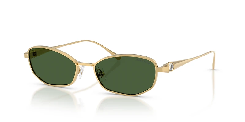 Elevate your style with the Swarovski SK7042 sunglasses. The rectangular frames in a gleaming gold hue exude modern elegance with their clean lines and lightweight metal construction. Adorned with Swarovski's signature sparkle, the slim temples feature octagonal crystal accents at the hinge for a touch of luxury. Complete with green classic lenses and adjustable nose pads for added comfort, these gold sunglasses blend sophistication and versatility effortlessly.