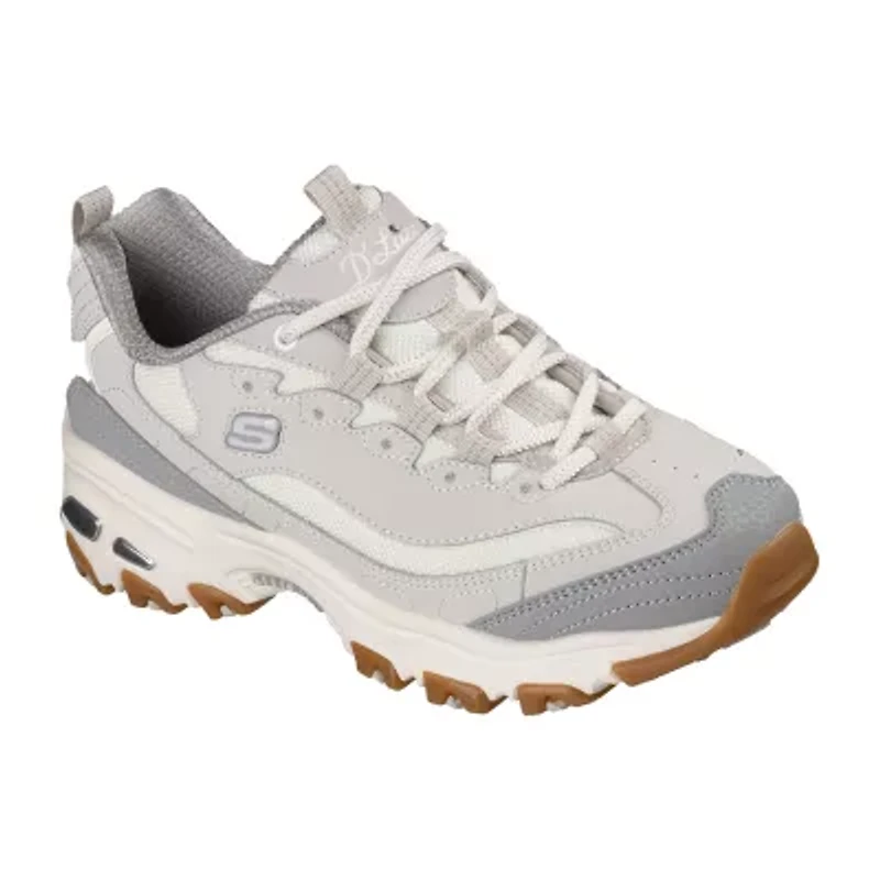 Trending style and comfort combine in the iconic classic Skechers D'Lites® - Popular Vote. This lace-up fashion style features a leather and mesh upper with synthetic trim and a cushioned Air-Cooled Memory Foam® insole.