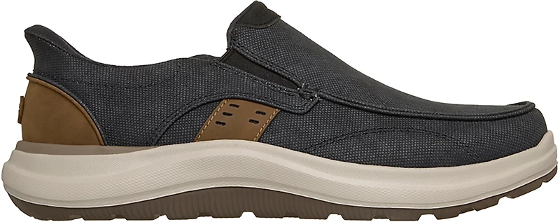 Look your best when you wear the SKECHERS Men's Altman Murdock Slip In Shoes. Their moc-toe canvas upper is decorated with faux leather details. The charcoal-infused insole helps neutralize potential odor, and their flexible traction outsole helps keep you stable. The Skechers Air-Cooled Memory Foam® insole provides cushioned comfort.