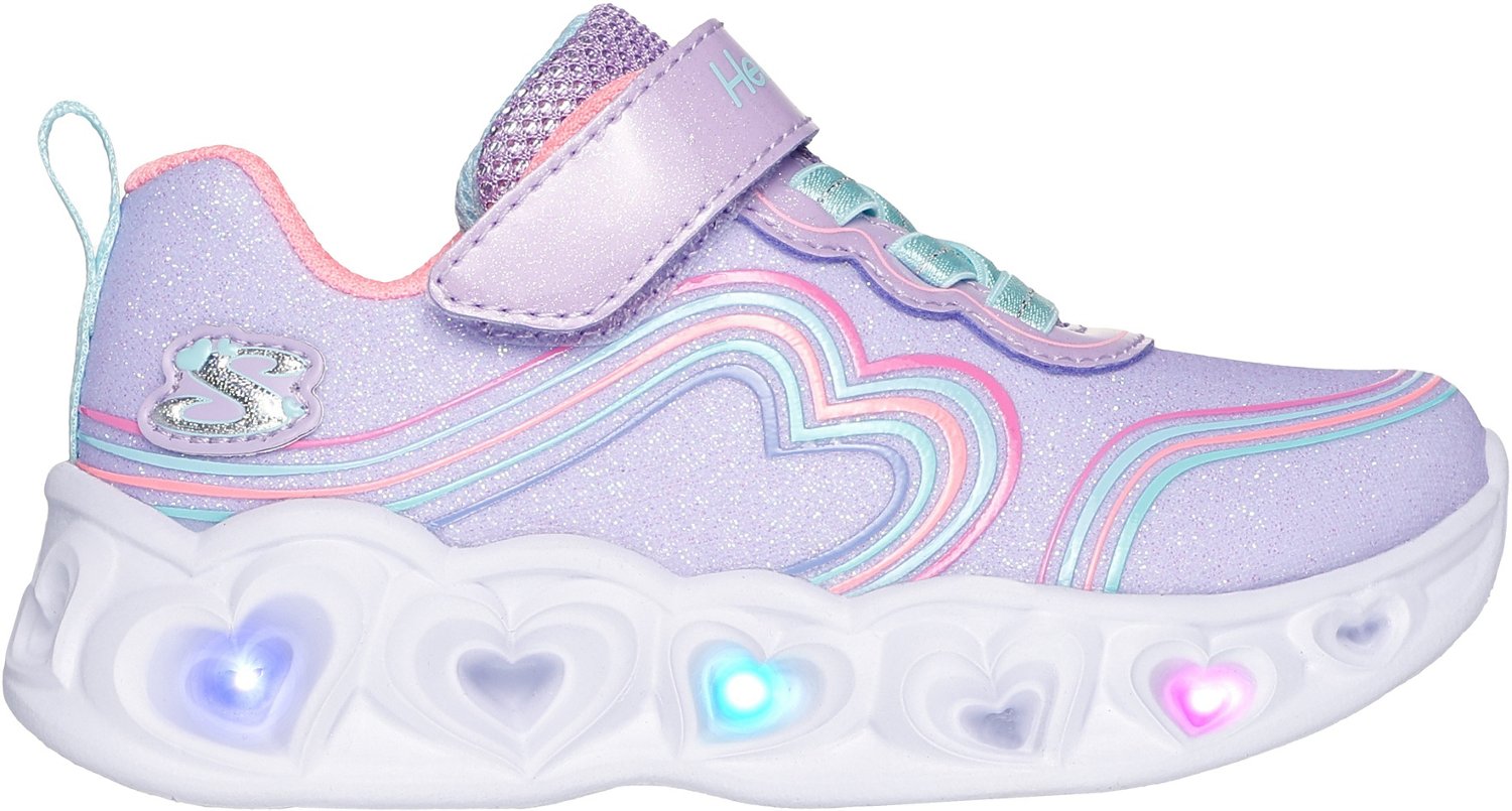 Add a cute touch to your little one's outfit with the SKECHERS Toddler Girls' Heart Light Retro Hearts Shoes. These shoes have a 3D rainbow heart print and a light-up design that offer an eye-catching appearance, and they have comfort insoles to make sure your little one's feet stay comfortable all day long. The sparkle mesh uppers deliver breathability, and the stretch-lace closure makes it easy for your little one to slip the shoes on and off easily.