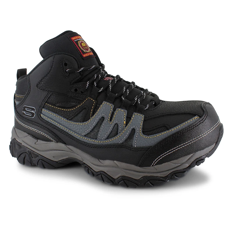 The Skechers Holdredge - Rebem is comfortable all in one stylish yet durable hiking boot design. Crafted from synthetic leather with overlays that offer additional support and durability when combined with a steel safety toe. The Relaxed Fit design and mesh panels provide a roomy yet breathable feel that keeps your feet feeling refreshed. A Gel Infused Memory Foam insole cushions your foot to the max for all-day comfort while a shock-absorbing midsole and slip-resistant rubber outsole ensure superior support and traction.