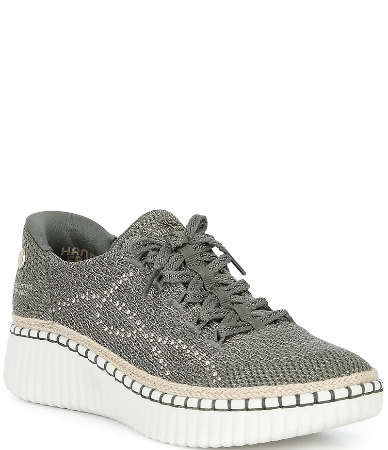 From Skechers x Martha Stewart, the Women's Wilshire Blvd Regal Sparkle Knit Sneakers feature: Sparkle knit upper crafted with 100% vegan materials Bead accents and faux laces Stretch Fit® design for sock-like comfort Skechers Hands Free Slip-ins® molded heel panel for an easy fit Heel Pillow® holds your foot securely in place Skechers Air-Cooled Memory Foam® cushioned insole provides instant comfort and breathability Fluted midsole with stitching detail and jute trim Flexible traction rubber outsole Approx. 1.5" heel height Imported.