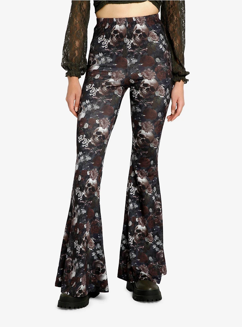 Pull on these bell bottoms decorated with skulls and flowers and your outfit is half done! They're stretchy and super comfy and bring a dark romance to your look.