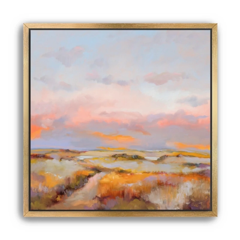 Experience the tranquil beauty of nature with this Sky on Fire Framed Canvas Art Print! This artwork captures a serene scene of vast fields with tall grasses and gentle hills, bathed in the warm, soothing hues of a setting or rising sun. Overall dimensions Width: 40 in. Depth: 2 in. Height: 40 in. Distinctively printed on stretched canvas Gold wood frame around wrapped canvas Features an abstract nature subject Hues of orange, blue, pink, brown, and gray Artist: Odile Weight: 15 lbs. Hangs from back-mounted hardware Care: Dust with a soft, dry cloth. This item is available at Kirklands.com only, not available in stores. Please note: this item cannot be shipped to APO/FPO addresses.