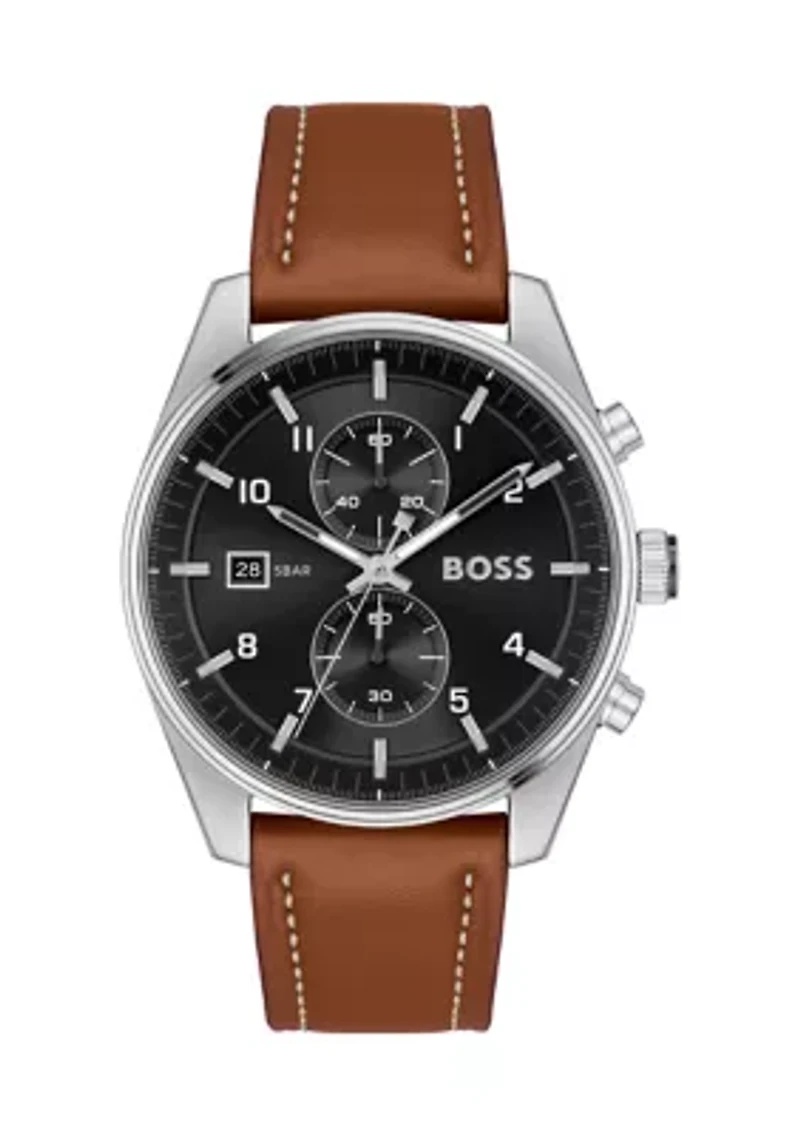 This men's watch from HUGO BOSS combines classic and sporty elements for a sophisticated timepiece. Its Japanese quartz movement ensures precision, while the buckle closure provides a secure fit. The watch features a chronograph dial and date function, along with elegant, tapered indexes and a prominent reflector ring. Choose from a variety of color combinations and strap options, including stitched leather, mesh bracelet, or link bracelet, to match your personal style. Buckle closure Chronograph dial Japanese quartz movement Brushed finish 2-year limited parts and labor warranty available Imported Product Specifications 44 mm case size Material & Care Stainless steel Clean with a soft cloth