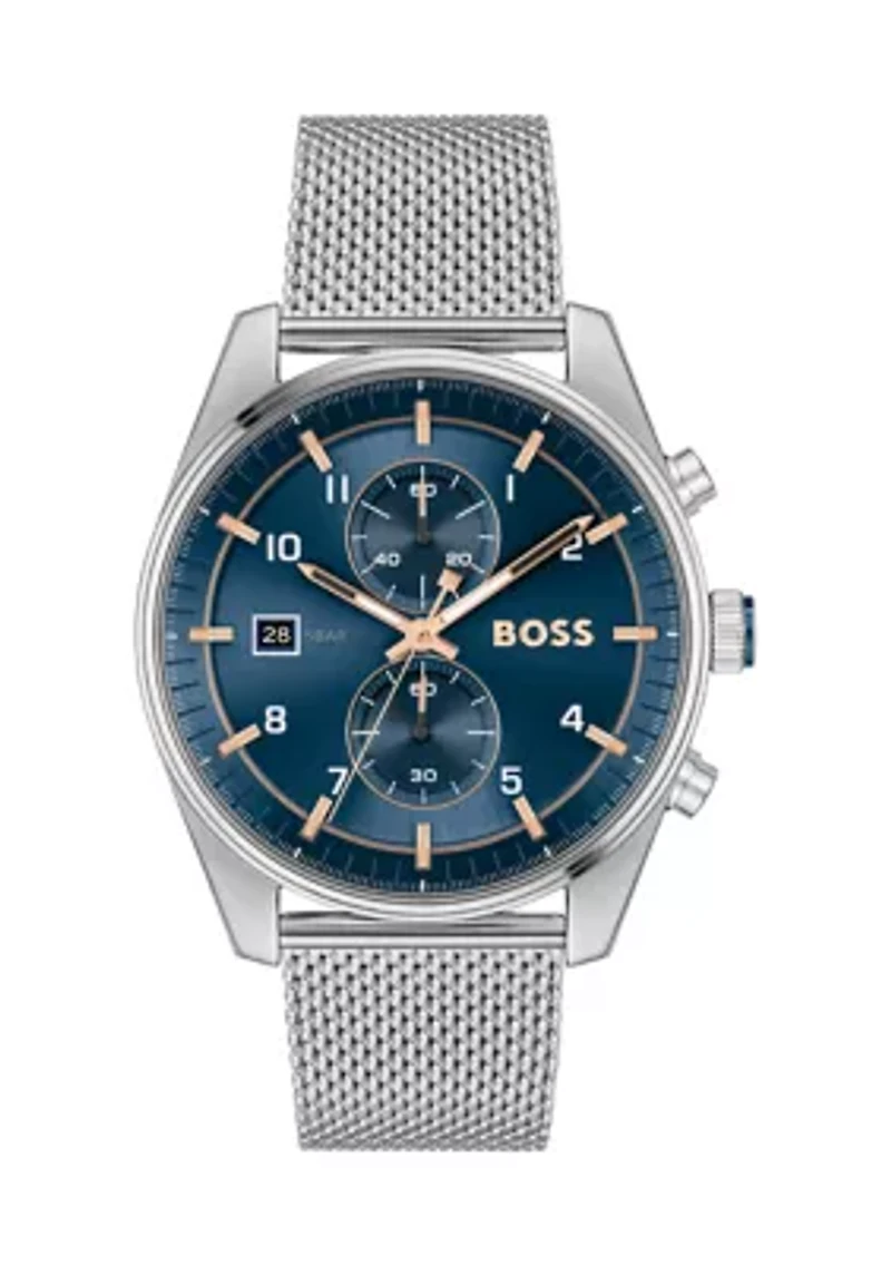This men's watch from HUGO BOSS combines sporty and sophisticated elements for a truly iconic timepiece. With a Japanese quartz movement ensuring precision, it features a foldover buckle clasp for secure wear. The prominent diamond-cut reflector ring and CD-cut sub-eyes add a touch of luxury, while the elegant, tapered indexes with chamfered edges provide a sleek look. Choose from a stitched leather strap, mesh bracelet, or link bracelet, all available in a variety of colors, to match your personal style. Foldover buckle clasp closure Chronograph dial Japanese quartz movement Brushed finish 2-year limited parts and labor warranty available Imported Product Specifications 44 mm case size Material & Care Stainless steel Clean with a soft cloth