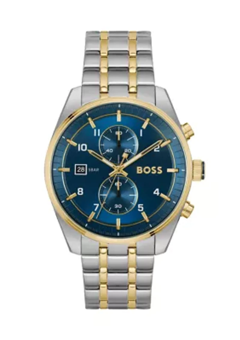 BOSS puts its iconic stamp on the classic pilot's watch with the Skytraveller, a sporty and sophisticated chronograph with a date function. The modern timepiece boasts a host of exciting design details, including a prominent, diamond-cut reflector ring, CD-cut sub-eyes at 12 and 6 o'clock, and elegant tapered indexes with chamfered edges. A choice of stitched leather strap, mesh bracelet, or link bracelet, in a variety of color combinations, ensures the Skytraveller is as versatile as it is stylish Butterfly clasp Chronograph dial Japanese quartz movement Brushed finish 2-year limited parts and labor warranty Imported Product Specifications 44 mm case size Material & Care Stainless steel Clean with a soft cloth