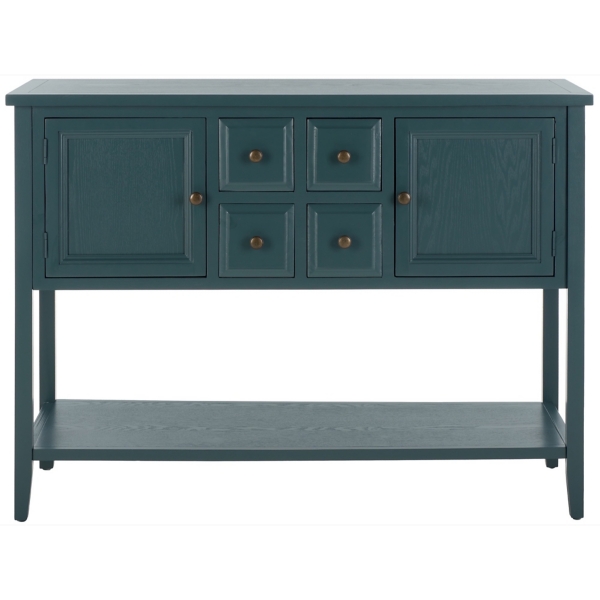 Maximize your space with this Slate Teal 4-Drawer Charlotte Sideboard! This sophisticated cabinet features a combination of drawers and cabinets so you can stay organized without sacrificing style! Sideboard measures 45.7W x 15D x 34H in. Crafted of pine and elm wood Slate teal finish Features two (2) cabinets and four (4) petite drawers Weight: 69 lbs. Weight capacity: 110 lbs. Assembly required Not intended for commercial use Care: Dust with a soft, dry cloth. This item is available at Kirklands.com only, not available in stores. Please note: this item cannot be shipped to APO/FPO addresses.