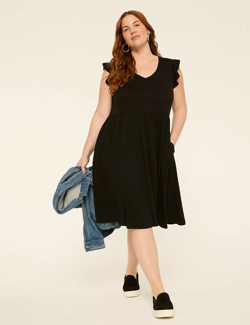 Available in Plus Size This basic dress is the go to for casual look everyday. FIT: Fit & Flare. Universally flattering silhouette with a classic fit bodice, fitted waist and flared skirt. Front Length (On Body): 42" (hits mid to lower calf) Short length FEATURES: V-neck Sleeveless FABRIC: Soft fabric Machine Wash Cold With Like Colors Gentle Cycle Only Non-Chlorine Bleach When Needed Tumble Dry Low Cool Iron If Needed 65% Polyester/34% Rayon/1% Spandex Item Number #414562 Imported Plus Size Dress ". Plus Size Sleeveless Short Dress, in Black, 14/16, Women's, Lane Bryant