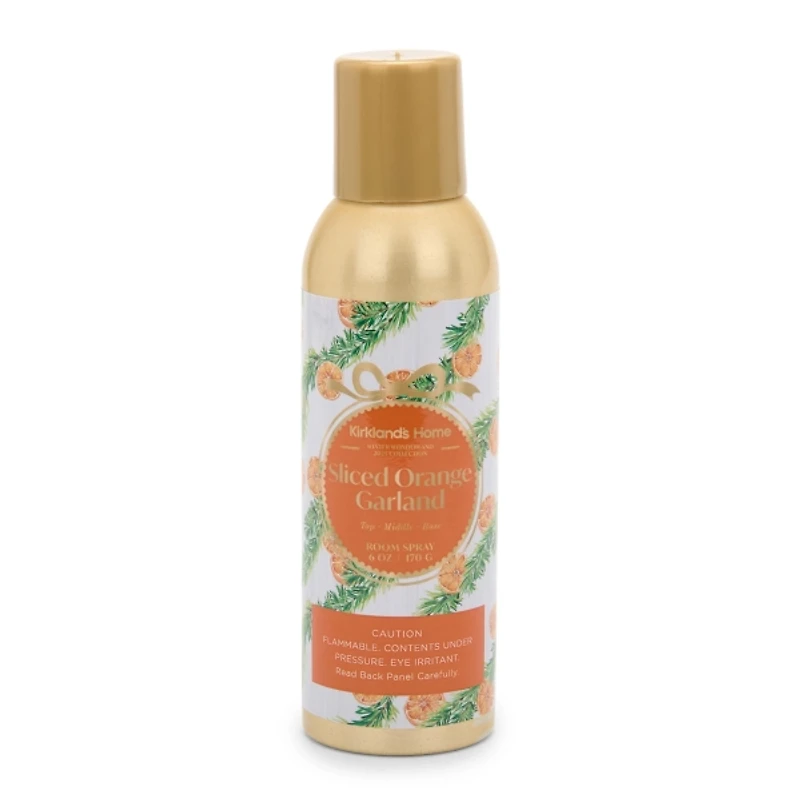 Our Sliced Orange Garland Aerosol Room Spray mixes energizing citrus, warm clove, and fresh aldehydic notes to create a festive scent. Christmas gatherings will feel lively and inviting with this holiday fragrance. Gold metal bottle with lid Aerosol spray Contains 6 oz. of spray Easy-to-use spray nozzle Top notes: orange, grapefruit Middle notes: clove, candy, peel Base notes: aldehydic, wood Care: Do not ingest. Avoid contact with eyes. Contact your local Kirkland's store for availability. Quantities and selection may vary by location.