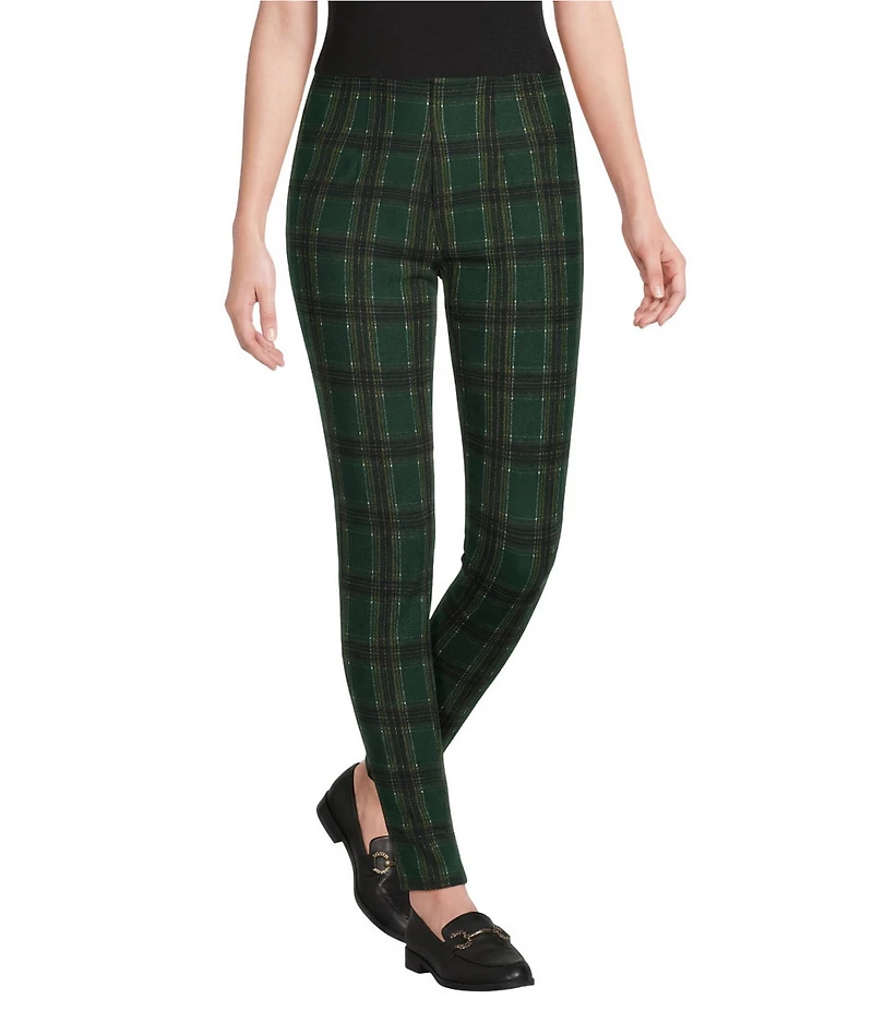From Slim Factor by Investments, these leggings feature: Ponte knit fabrication 4-way stretch fabric provides comfort all-day No waist elastic waistband helps to slim and flatter the body Gentle compression that slims, smooths, and elongates the leg Mountain plaid print Pull-on construction Approx. 27" inseam Rayon/nylon/spandex Machine wash/line dry Imported.