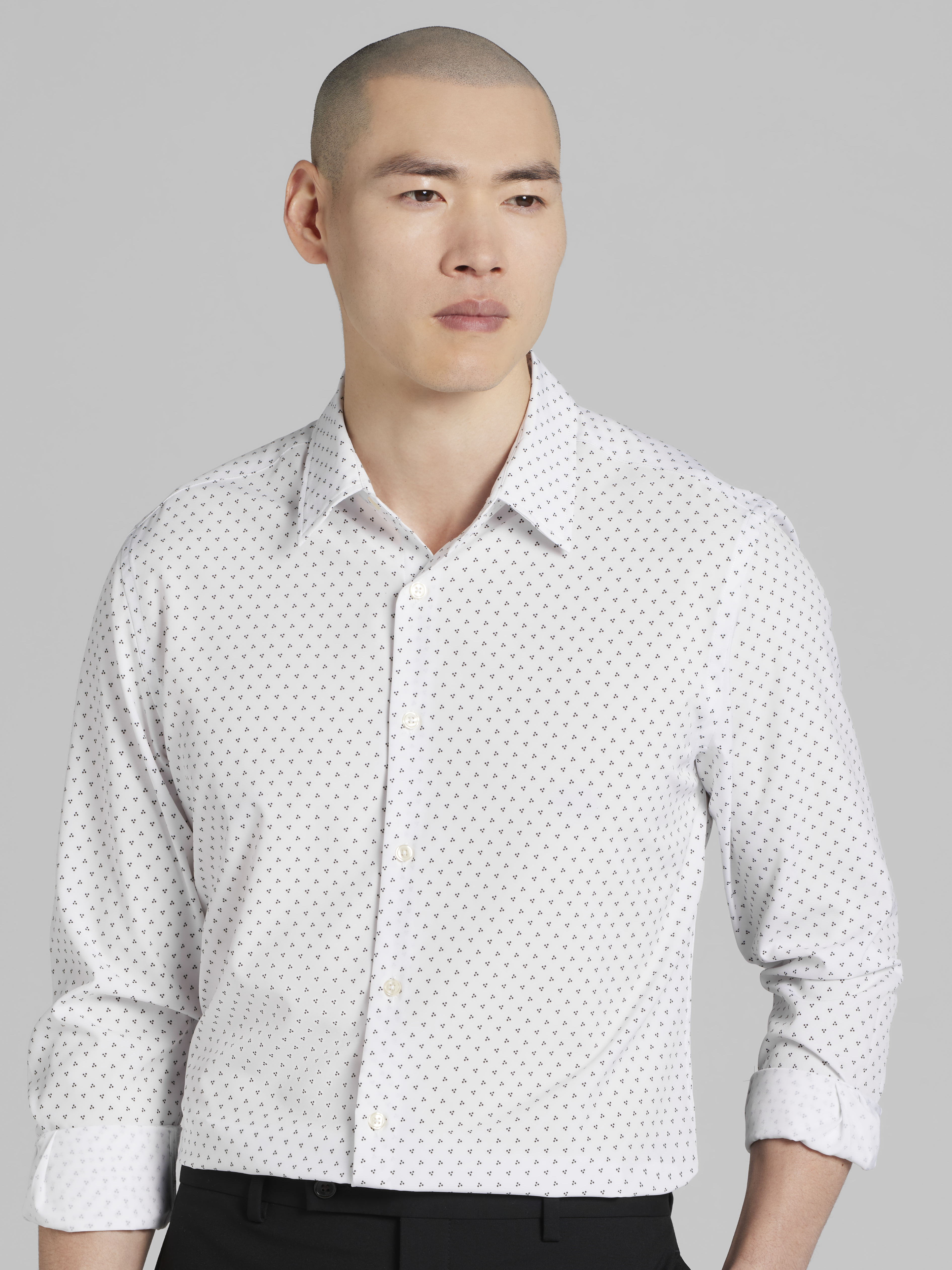 For those who mean business while keeping it cool, this slim fit button-up shirt delivers the ultimate flexibility with its 4-way stretch. Perfect for days when your schedule takes you from desk to dinner, its refined look gets a modern upgrade with a touch of subtle tri-dot style. Whether you're powering through a meeting or turning heads at an evening soiree, it's designed to move with you, keep its sharp silhouette, and never miss a beat. A point collar and button-front closure seal the deal on effortless sophistication. Your wardrobe has officially leveled up.
