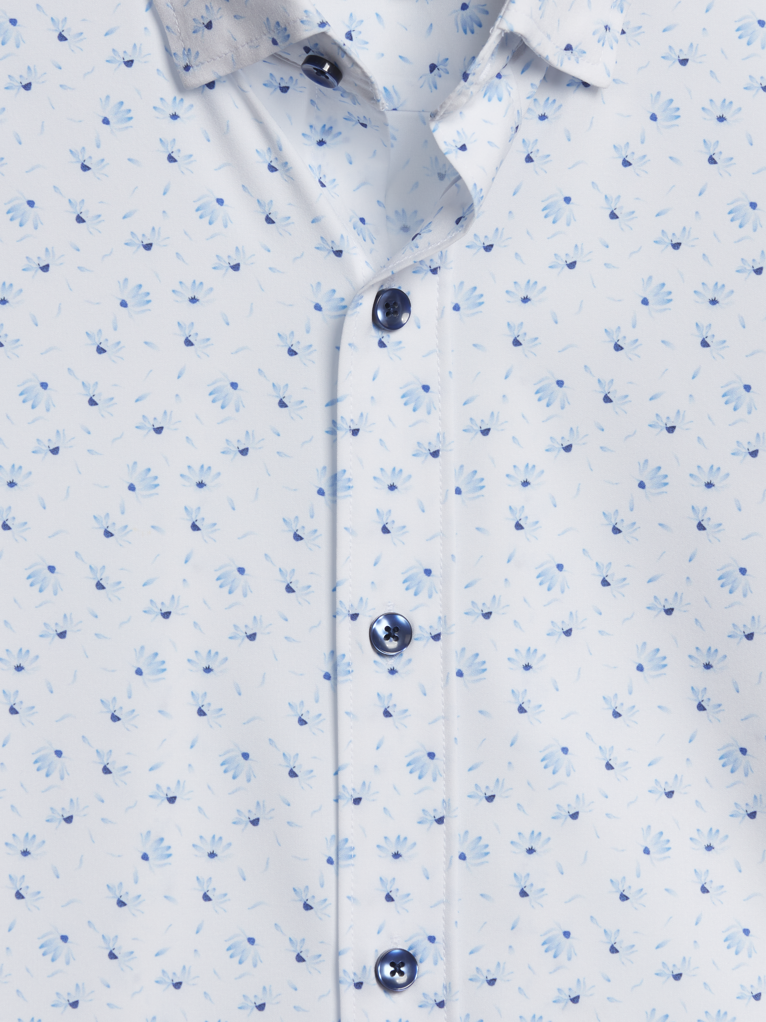 Embody easy-breezy polish with this short-sleeved casual button up shirt. The fine floral motif adds charm while the innovative, 4-way stretch fabric offers a flattering silhouette and freedom of movement. Streamlined with a Slim Fit, it goes with shorts as well as slacks, chinos, or jeans.