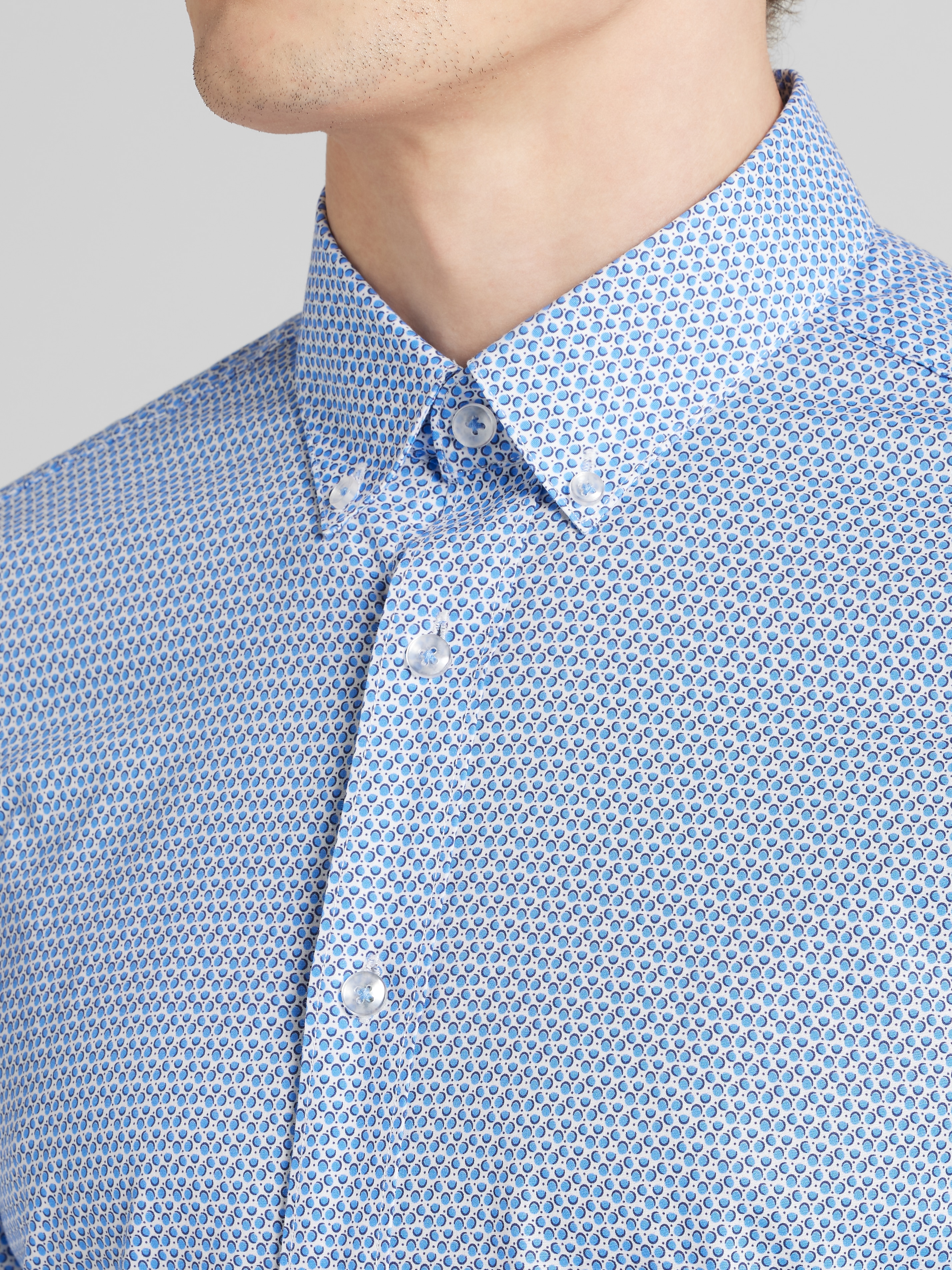 Light blue, but not light on style. This slim fit dot button up shirt blends modern vibes with classic charm, ensuring you're always date-night ready. Crafted from a light-weight cotton blend with a touch of 2-way stretch, this shirt moves with you, whether you're dominating at work or dazzling at the derby. The full-length sleeves, classic collar, and straight-cut silhouette make it a versatile pick - casual yet crisp. Why settle for ordinary when you can button up with flair?