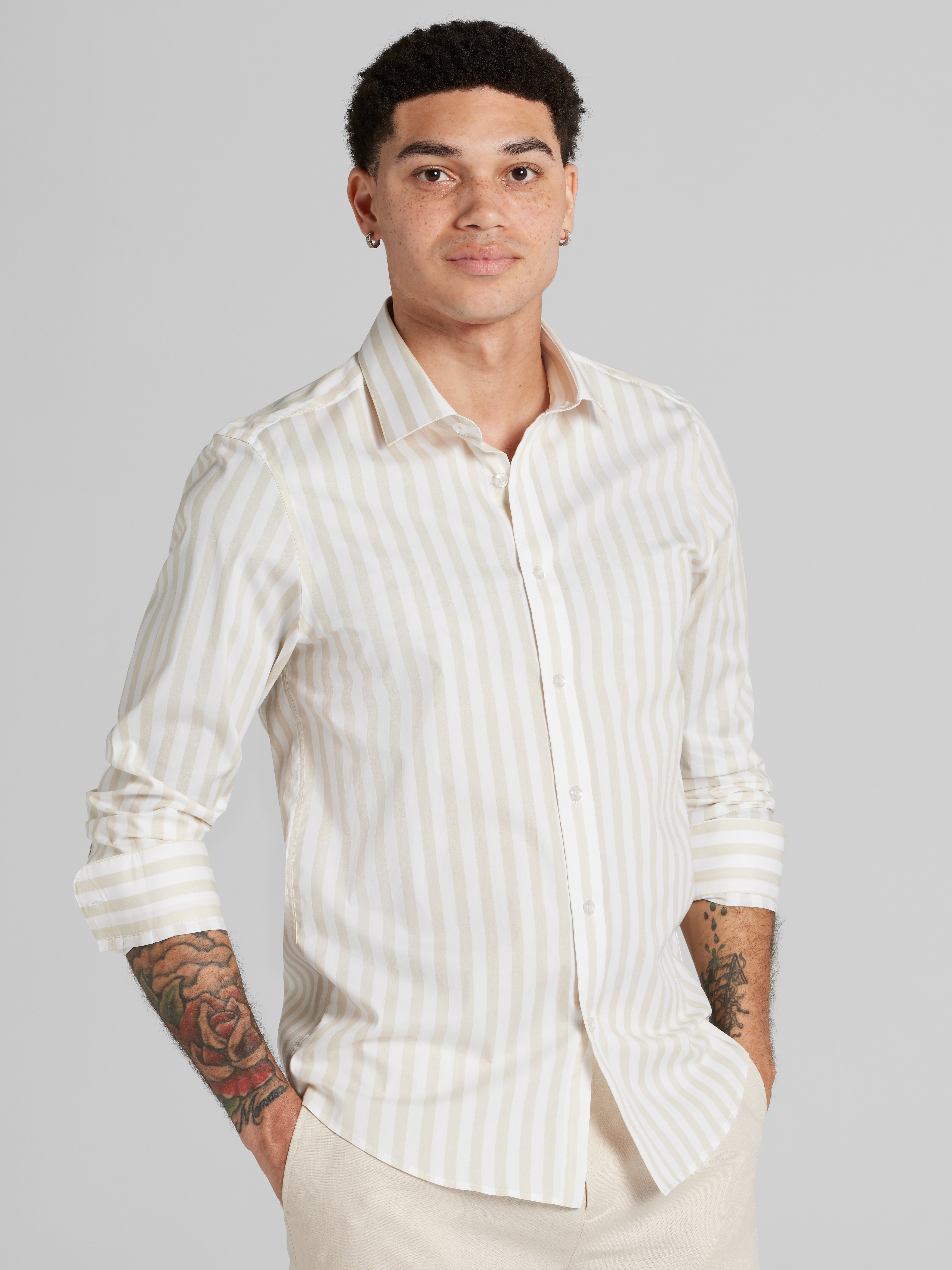 Bring some bold vibes to your casual rotation with this slim fit wide stripe button up shirt. With vertical stripes serving major sleek energy, this shirt amps up any date night or smart-casual outing with effortless style. Designed with full-length sleeves, button cuffs, and classic collared neck, it's all about understated charm. The cotton blend fabric keeps things breezy and comfortable whether you're mixing up cocktails or just mixing up your outfit game. It's versatile, modern, and dials up the dapper with zero effort. Stay sharp, stay timeless.