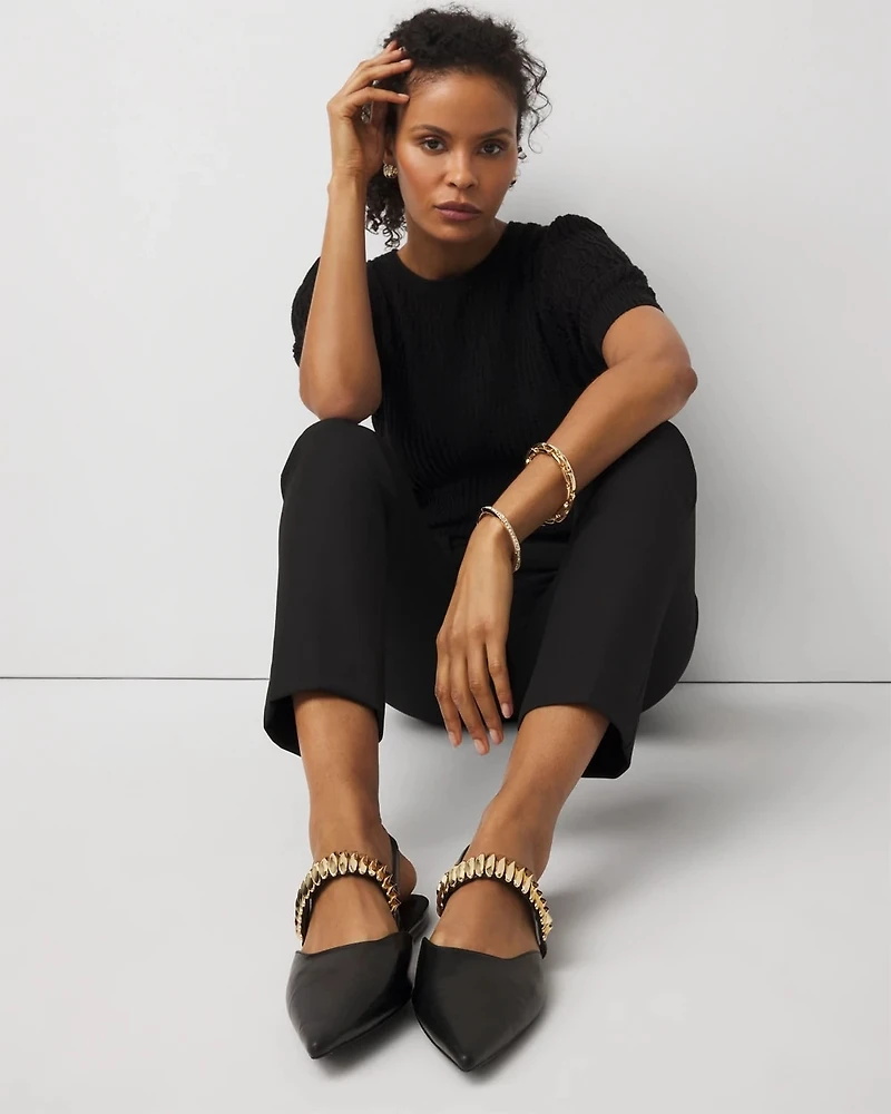 This slingback flat is crafted from soft, plush faux leather accented with a modern goldtone sculptural band. The elastic slingback makes them easy-to-wear. Pair them with pieces from our Sculptural Wave jewelry collection.